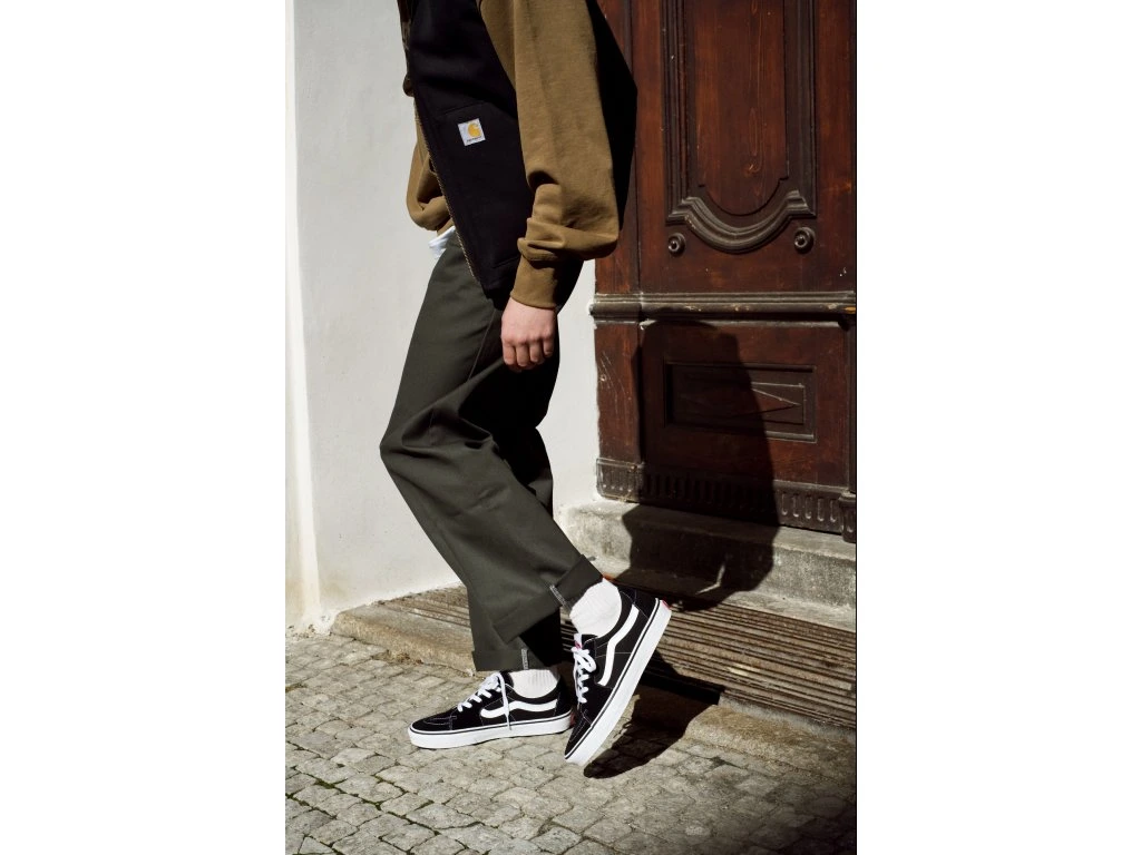 Originální klasika z 65% polyesteru, 35% bavlněného kepru* a o gramáži 8,5oz. Díky použití bavlněného kepru zaručují kalhoty pevnost a odolnost materiálu. Original fit je široký a rovný střih kalhot s vyšším setem pasu, který má 7 poutek pro pohodlné nošení pásku. Kalhoty mají 2 přední kapsy se vstupem z boku, které jsou typické pro modely pracovních kalhot. Zadní kapsy jsou 2, z toho levá má knoflík na zapínání a nad pravou je černá nášivka s barevným logem.