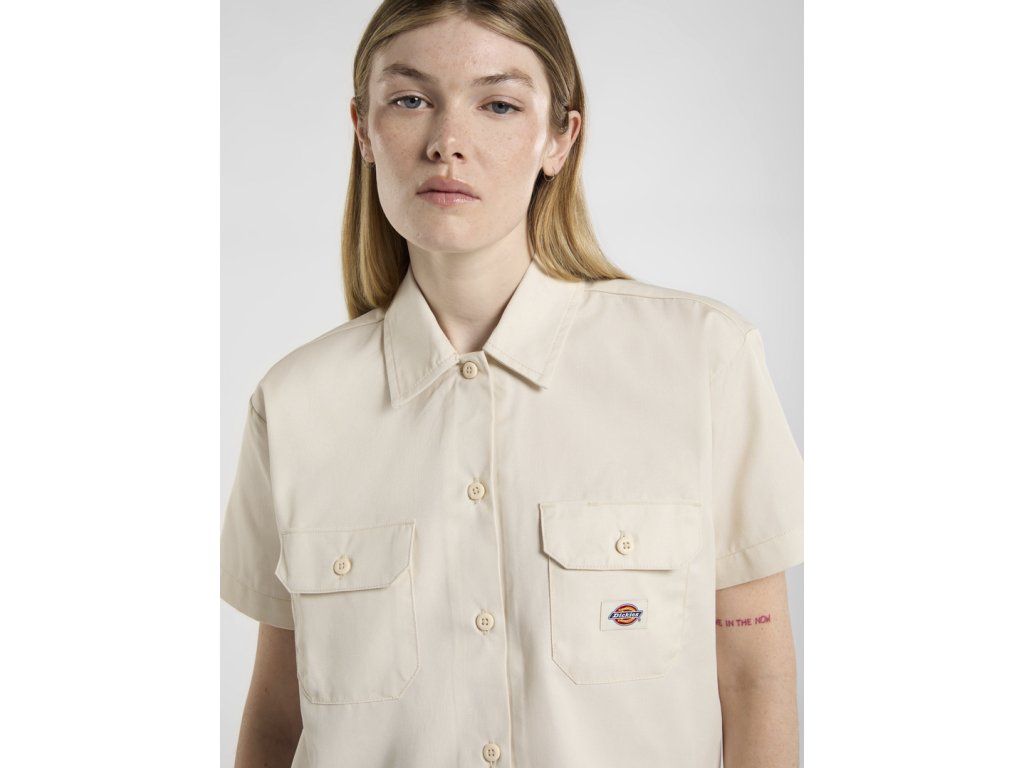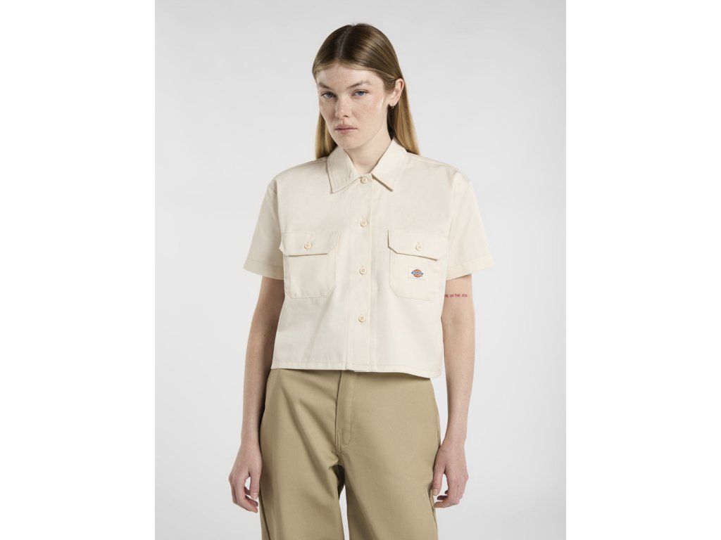 Košile Dickies Cropped Short Sleeve Work Shirt je dámský model z EU kolekce, který vychází z klasické pracovní košile Dickies, ale přináší ji v moderní cropped a boxy siluetě.