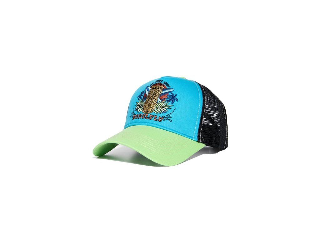 Kšiltovka King Kerosin Honolulu Cap přináší hravý retro styl inspirovaný Havají, surfem a hot rod kulturou. Výrazná barevná kombinace green / turquoise a grafický motiv dodávají kšiltovce nepřehlédnutelný charakter.
