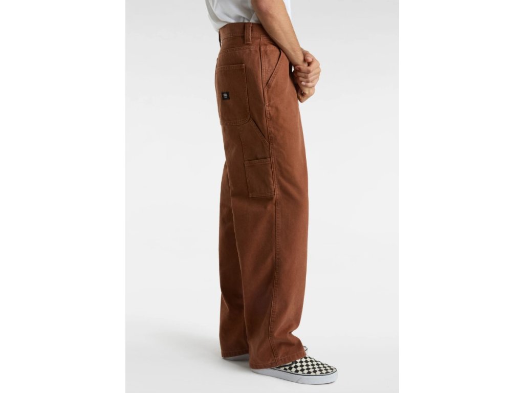 Volné džíny Drill Chore Carpenter jsou vyrobeny ze středně těžké tkané bavlněné džínoviny a mají tradiční prvky pracovních kalhot pro tesaře, včetně poutka na kladivo u levé zadní kapsy a kapsy na nářadí pod pravou kapsou. Další detaily dodávají těmto klasickým tesařským kalhotám styl, například poutko na opasek ve tvaru „V“ na zadní části pasu a nová vlajková etiketa všitá do vnitřního lemu nohavic, která je viditelná při ohrnutí.